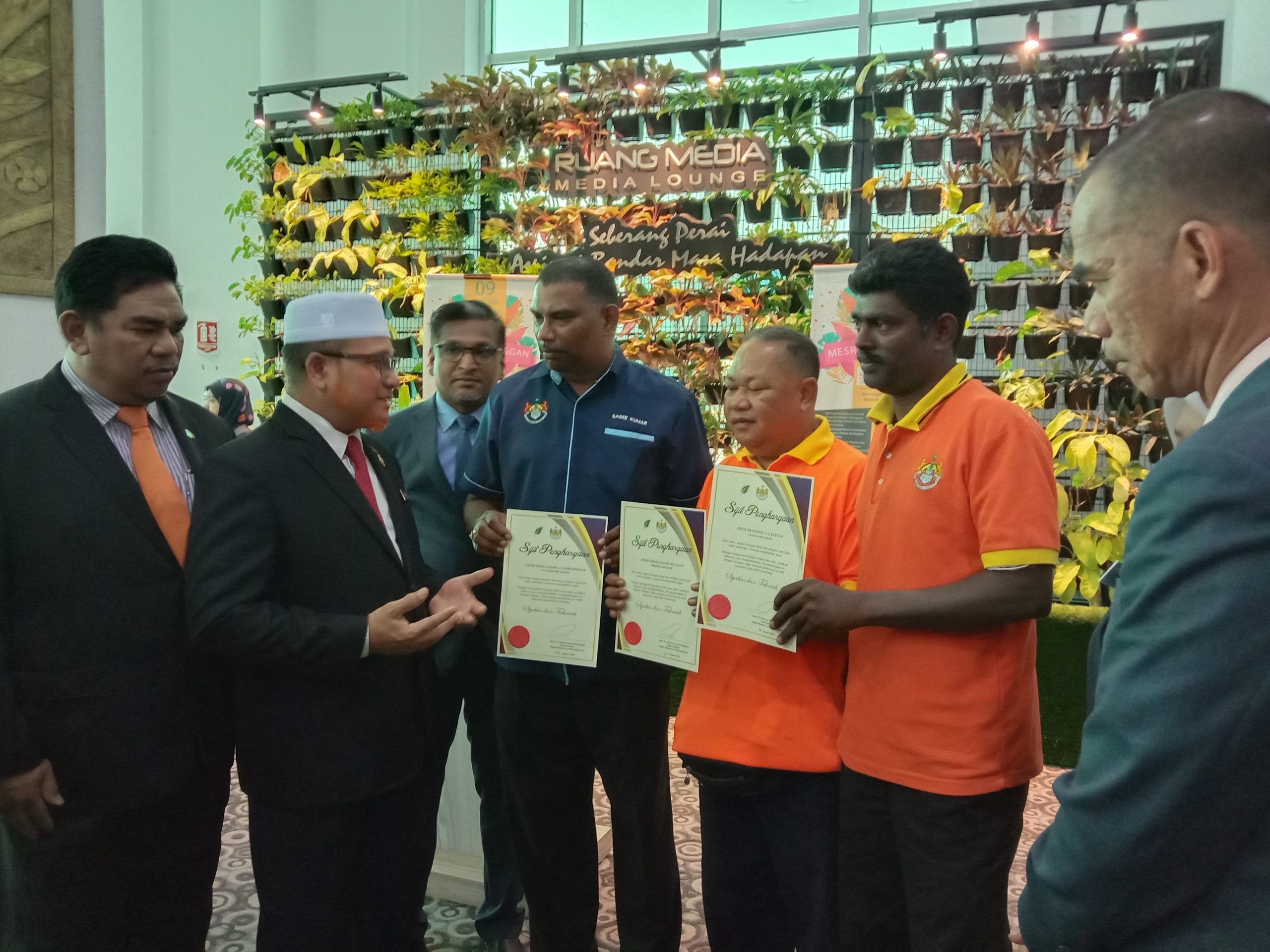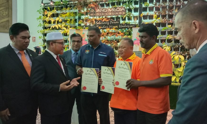 SEBERANG JAYA – Tiga ‘Wira Oren’ menerima sijil penghargaan khas daripada Majlis Bandaraya Seberang Perai (MBSP) selepas bertindak menyelamatkan anjing liar yang cedera pada 17 Januari lalu.
