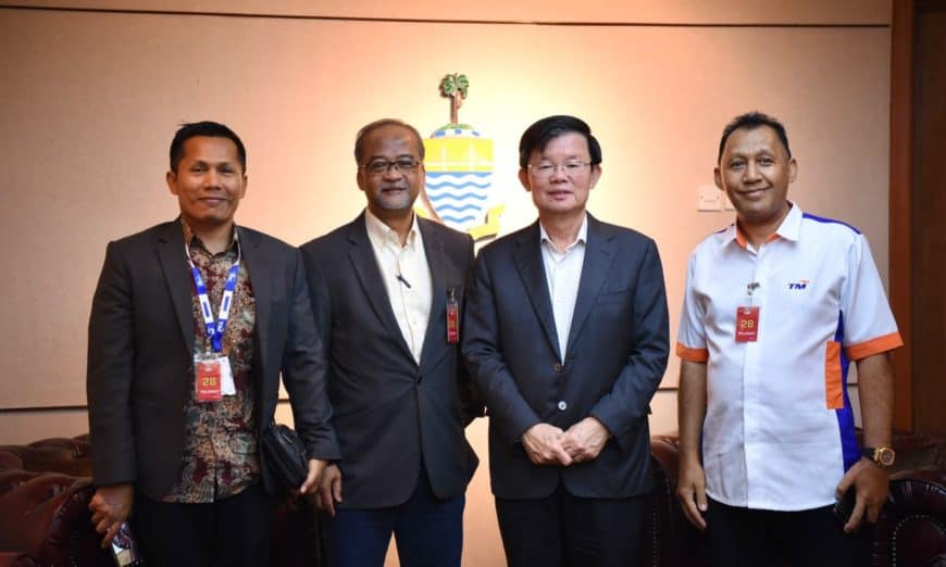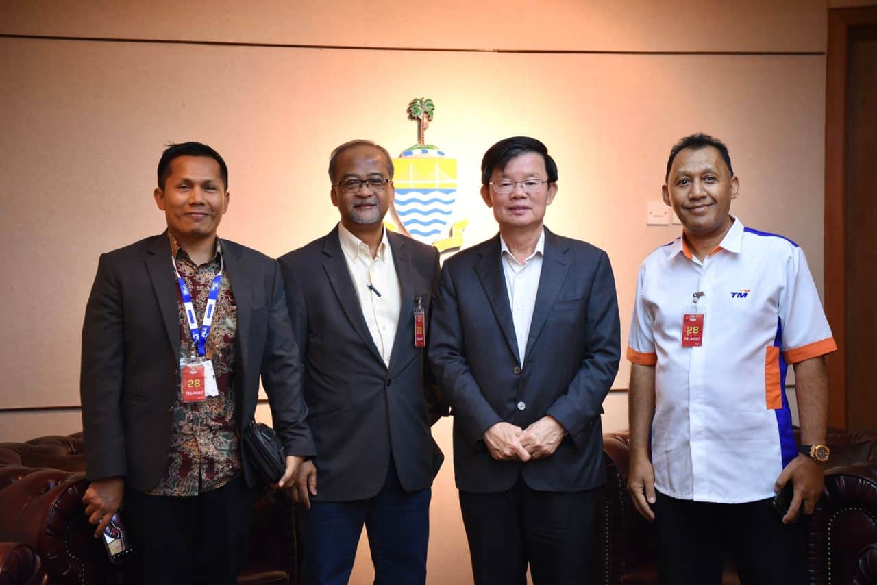 GEORGE TOWN – Ketua Menteri, Y.A.B. Tuan Chow Kon Yeow sebentar tadi menerima kunjungan hormat daripada Pengarah Strategi Pembangunan Perniagaan & Perhubungan Sektor Awam Telekom Malaysia (TM) Berhad, Datuk Paduka Mohd. Roslan Idris di pejabatnya di sini.