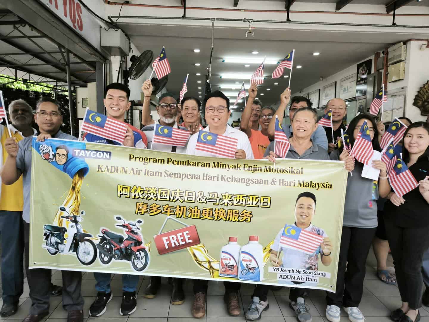 AIR ITAM – Sempena sambutan Bulan Kebangsaan dan Hari Malaysia pada tahun ini, Pusat Khidmat Kawasan Dewan Undangan Negeri (KADUN) Air Itam dengan kerjasama Taycon Motor menganjurkan program tukar minyak enjin motosikal secara percuma.