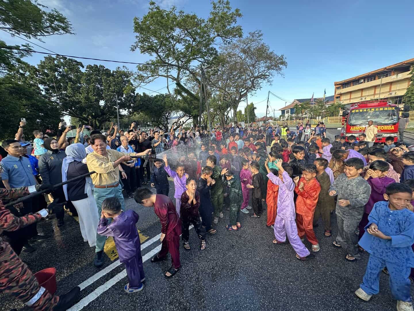 Yang Dipertua Negeri, Tuan Yang Terutama (TYT) Tun Ramli Ngah Talib bersama isteri, Y.M. Toh Puan Raja Noora Ashikin Raja Abdullah, berkenan hadir menyempurnakan acara simbolik memandikan kanak-kanak menggunakan pancutan air daripada jentera bomba bagi menceriakan suasana serta mengurangkan rasa gemuruh dalam kalangan peserta.