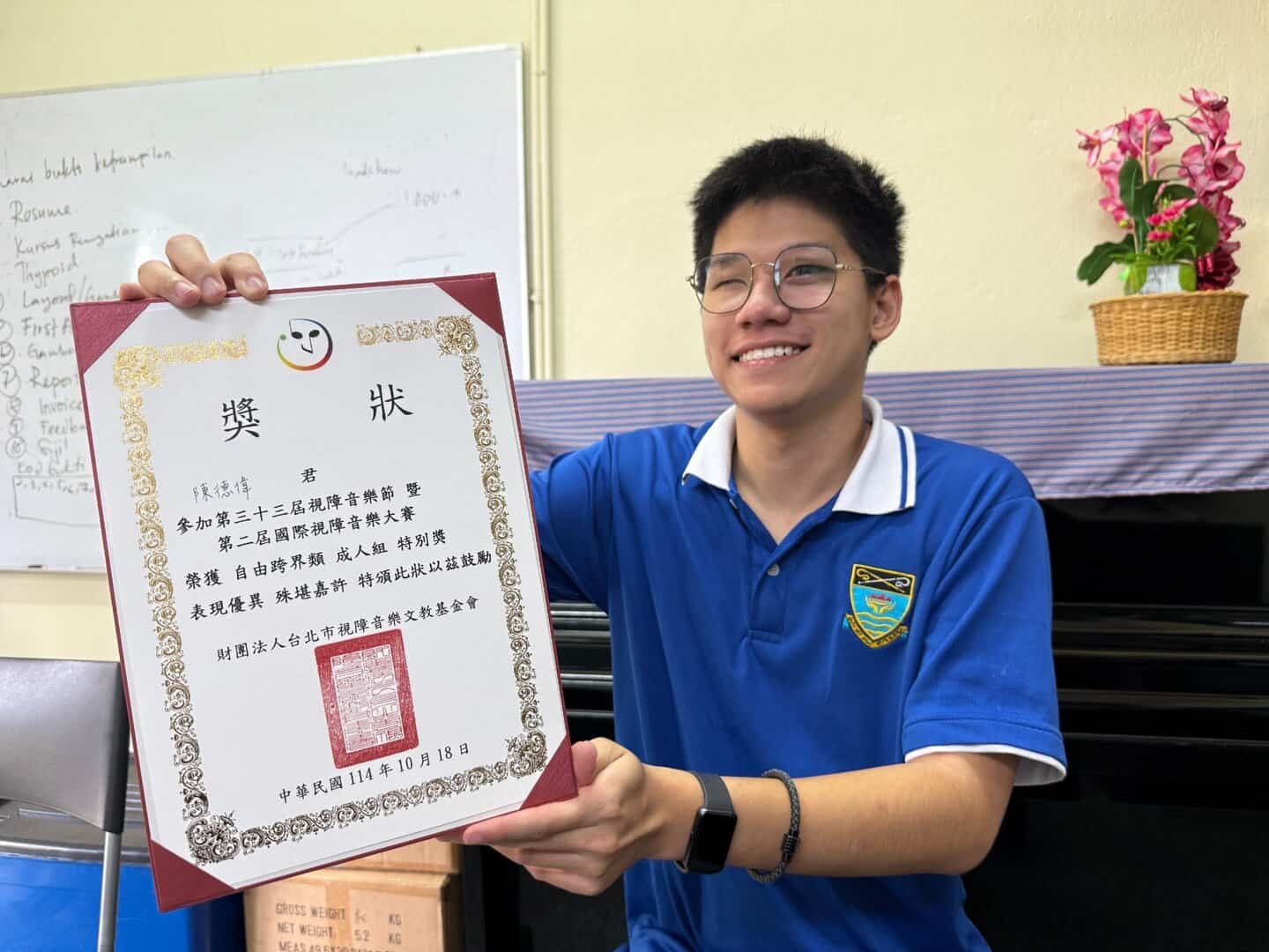 David Chin Teck Wai, 26, who is currently pursuing studies in Information Technology (IT) and interning at St Nicholas Home, represented Malaysia in the international event organised by the Taipei Visually Impaired Music Education Foundation.